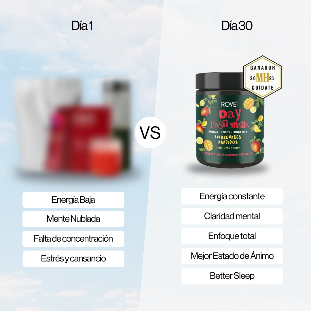 Sí. Tanto Day como Night Fast Track son compatibles con la mayoría de protocolos de ayuno intermitente, como el 12:12 o 16:8. Ten en cuenta que Day Fast Track contiene algunas calorías y carbohidratos, lo que técnicamente puede romper un ayuno estricto — pero muchos usuarios lo toman igualmente en su ventana de ayuno para apoyar su energía y concentración.