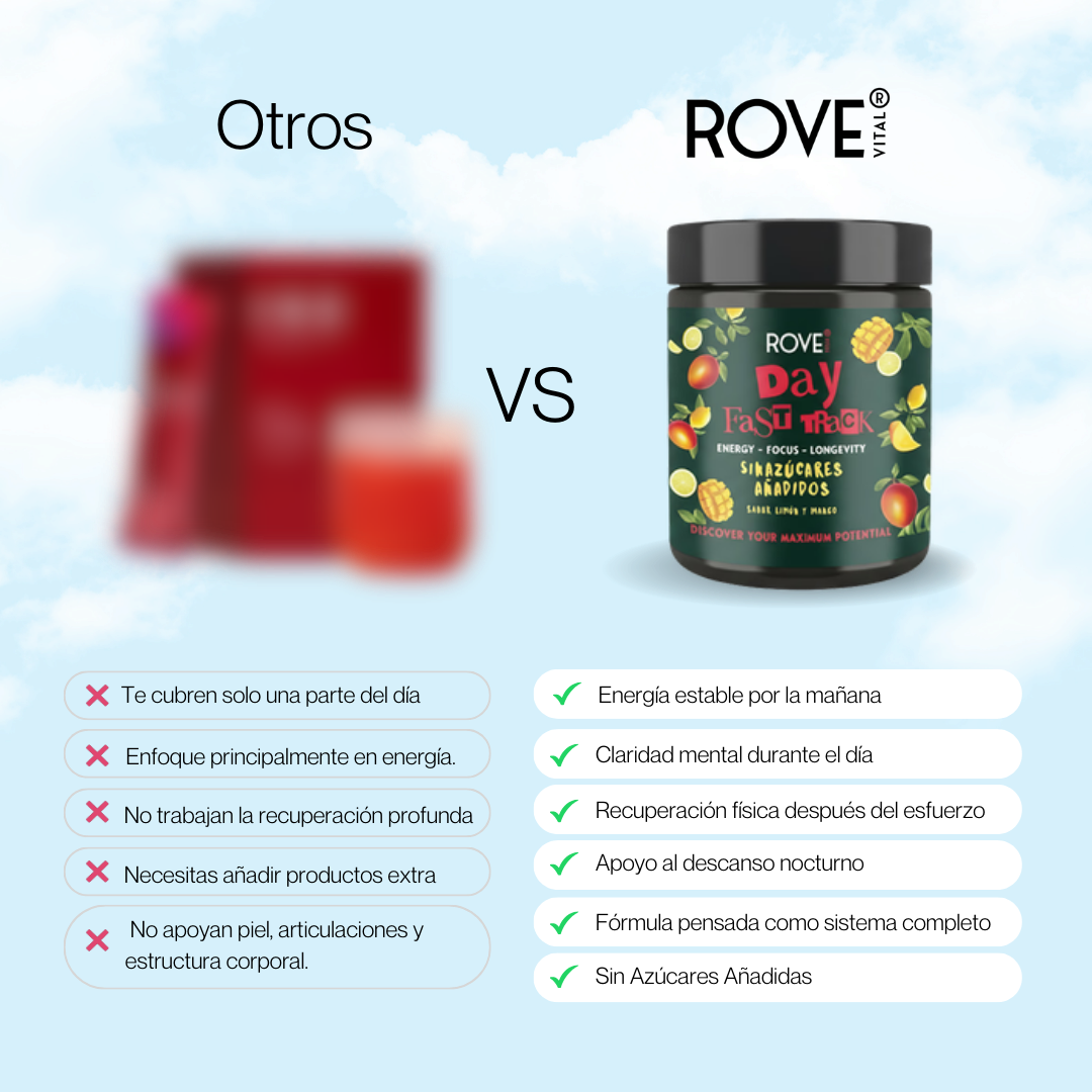 Rove Vital es un sistema de suplementación diseñado para ayudarte a mejorar energía, descanso, recuperación y bienestar diario con fórmulas específicas para distintos momentos y objetivos.