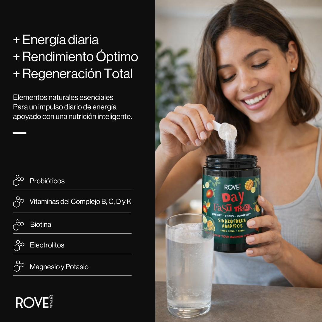Toma Day Fast Track por la mañana para apoyar tu energía y concentración durante el día. Por la noche, toma Night Fast Track aproximadamente 30-60 minutos antes de dormir para favorecer la relajación y la recuperación.
